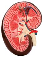 3.功能:腎作冠狀切面,顯示腎的上、下兩端、內外兩緣及前后兩面的外形特征,腎上端薄、下端厚,外緣凸,內緣中部凹,稱腎門,腎門是顯示腎血管、神經、淋巴管和輸尿管出入的部位,由前向后依次為腎靜脈、腎動脈、腎盂;從上到下依次為腎動脈、腎靜脈、腎盂,在腎的剖面上,主要顯示腎的皮質和髓質、腎錐體、腎乳頭、腎柱、腎小盞、腎大盞、腎盂及部分腎動靜脈分支、屬支的斷段。同時,還顯示輸尿管的起始部;