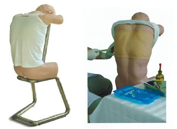 ■ 仿真標準化病人反向坐于靠背椅上,雙臂平置,形象逼真。