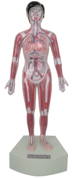 微電腦人體心動周期與大、小循環演示儀為成人女性,材質后部采用增強塑料,前部為PVC塑料,動靜脈采用紅、藍發光二極管,底座后方有220V電源插座,前上方有全身血液循環、體循環、肺循環、復位四個演示按鈕。