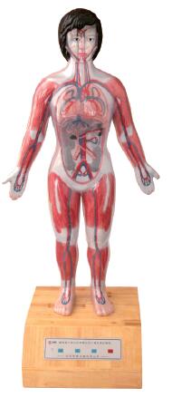 微電腦人體心動周期與大、小循環演示儀為成人女性,材質后部采用增強塑料,前部為PVC塑料,動靜脈采用紅、藍發光二極管,底座后方有220V電源插座,前上方有全身血液循環、體循環、肺循環、復位四個演示按鈕。