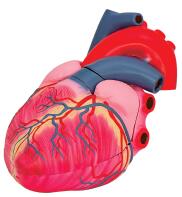 3.功能:模型外形部分,示冠狀溝,溝的上方為心底部,包括心房、心耳及出入心臟的大血管。示前、后室間溝為左右心室的分界。出人心臟的大血管有上、下腔靜脈,肺靜脈、肺動脈、主動脈及主動脈弓上發出的三條血管。(由右向左為頭臂干, 右頸總動脈、左鎖骨下動脈),營養心臟的血管有左、右冠狀動脈。示心小靜脈,心中靜脈,心大靜脈,及冠狀竇。內部構造:主要顯示四個心腔;此外,左右心房之間有房間隔,上有卵園窩,左右心室之間有室間隔,在隔上示膜部和肌性部;