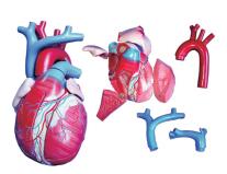 3.功能:模型外形部分,示冠狀溝,溝的上方為心底部,包括心房、心耳及出入心臟的大血管。示前、后室間溝為左右心室的分界。出人心臟的大血管有上、下腔靜脈,肺靜脈、肺動脈、主動脈及主動脈弓上發出的三條血管。(由右向左為頭臂干, 右頸總動脈、左鎖骨下動脈),營養心臟的血管有左、右冠狀動脈。示心小靜脈,心中靜脈,心大靜脈,及冠狀竇。內部構造:主要顯示四個心腔;此外,左右心房之間有房間隔,上有卵園窩,左右心室之間有室間隔,在隔上示膜部和肌性部;