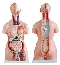 3.功能:顯示兩性人體內臟器官的位置及頭部解剖的形態和構造,表現呼吸、消化、泌尿,生殖 等主要人體解剖系統。頭頸右半側顯示顱骨、咬肌、顳肌等結構,眼眶內有眼球,在頭頸部作矢狀切面,顱腔容納腦的右半球,腦的腹側面有十二對腦神經,示鼻腔、口腔、喉部示喉腔,喉室、聲門裂、甲狀腺的外側葉后面示甲狀旁腺。胸腔內的兩肺額狀切面,顯示肺內結構,心臟作冠狀解剖,表示左右房室的構造異同,心臟血管有上下腔靜脈,肺動靜脈,主動脈,供講解大小血液循環應用。胸蓋顯示女性乳房外形及解剖狀,帶胸骨。后背打開,可示脊柱、脊髓和脊神經的相互關系;