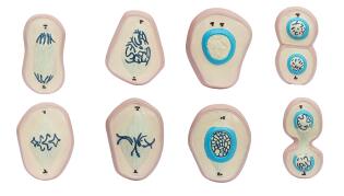 3.功能:核分裂主要顯示從細胞核內(nèi)出現(xiàn)染色體開始,經(jīng)過一系列的變化,最后分裂成二個子核為止。模型顯示核分裂過程的5個主要時期:即間期、前期、中期、后期、未期直至二個新的子細胞。胞質(zhì)分裂主要顯示二個新的子核之間形成新的細胞壁,把一個母細胞分隔成二個子細胞的過程,細胞核膜全透明;在分裂全過程的各個時期時的模型上,還分別顯示核模、核仁、染色體、細胞質(zhì)、紡錘絲、細胞板等主要結(jié)構(gòu);